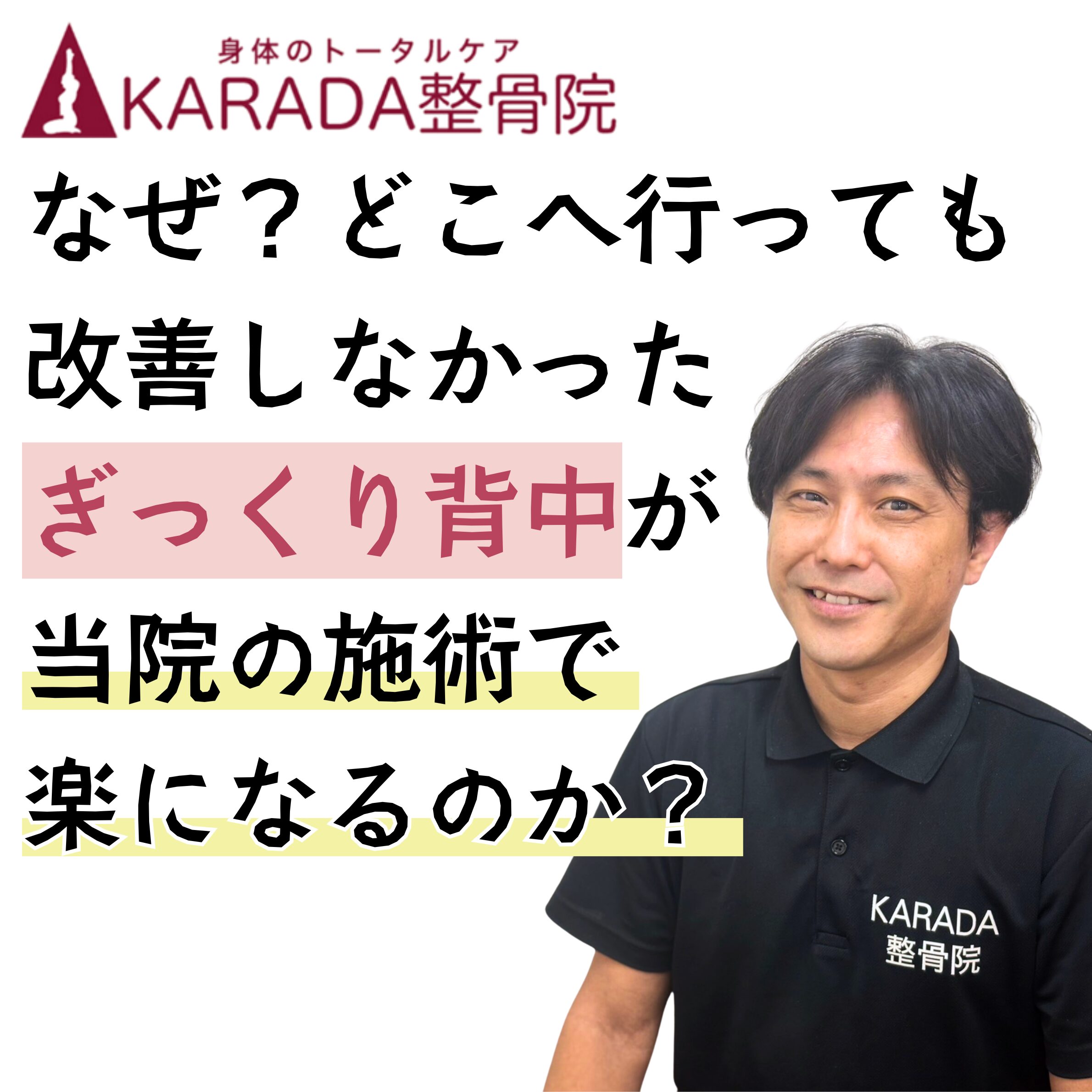 昨年ギックリ腰になった時に、KARADA整骨院を受診したところ、今までの整骨院とは違い、痛みの要因、日常動作の癖などを親切丁寧に説明していただき、初めて「改善するかも」と希望の光が見えました。