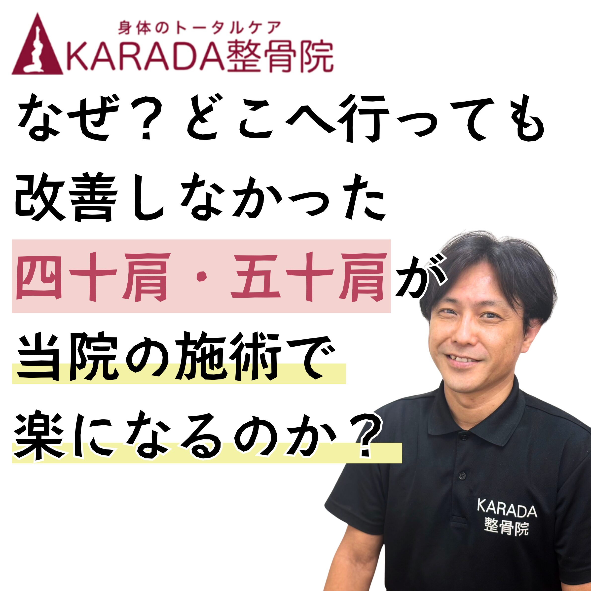 昨年ギックリ腰になった時に、KARADA整骨院を受診したところ、今までの整骨院とは違い、痛みの要因、日常動作の癖などを親切丁寧に説明していただき、初めて「改善するかも」と希望の光が見えました。