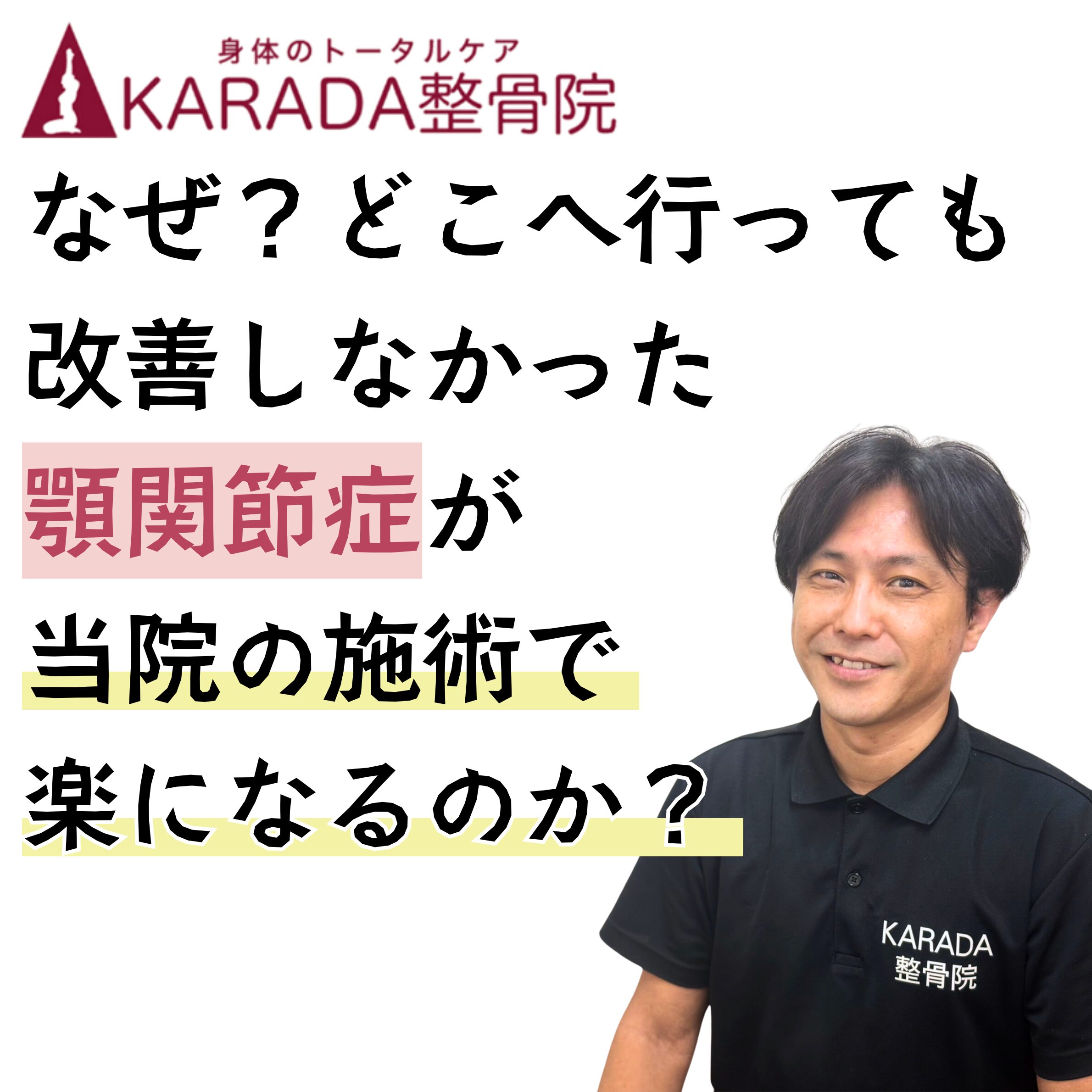 昨年ギックリ腰になった時に、KARADA整骨院を受診したところ、今までの整骨院とは違い、痛みの要因、日常動作の癖などを親切丁寧に説明していただき、初めて「改善するかも」と希望の光が見えました。